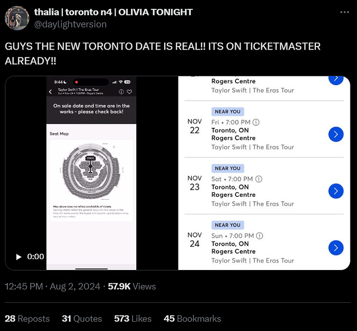 The new concert listing for November 24 at 7:00 p.m. at Toronto’s Rogers Centre showed a map of the concert venue and a message stating, “On sale date and times are in the works – please check back!”
